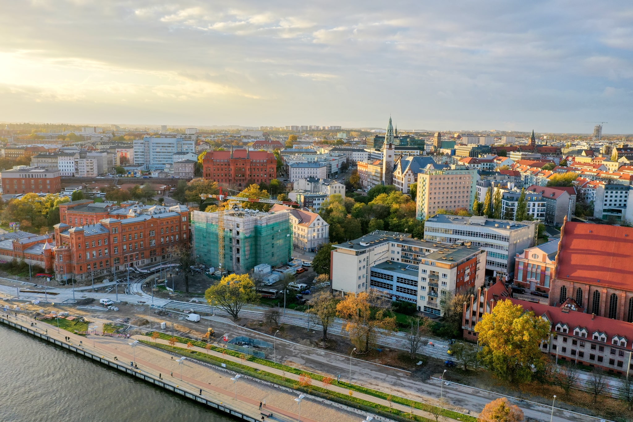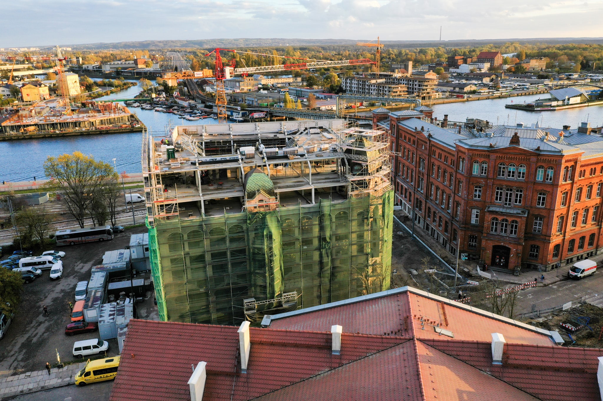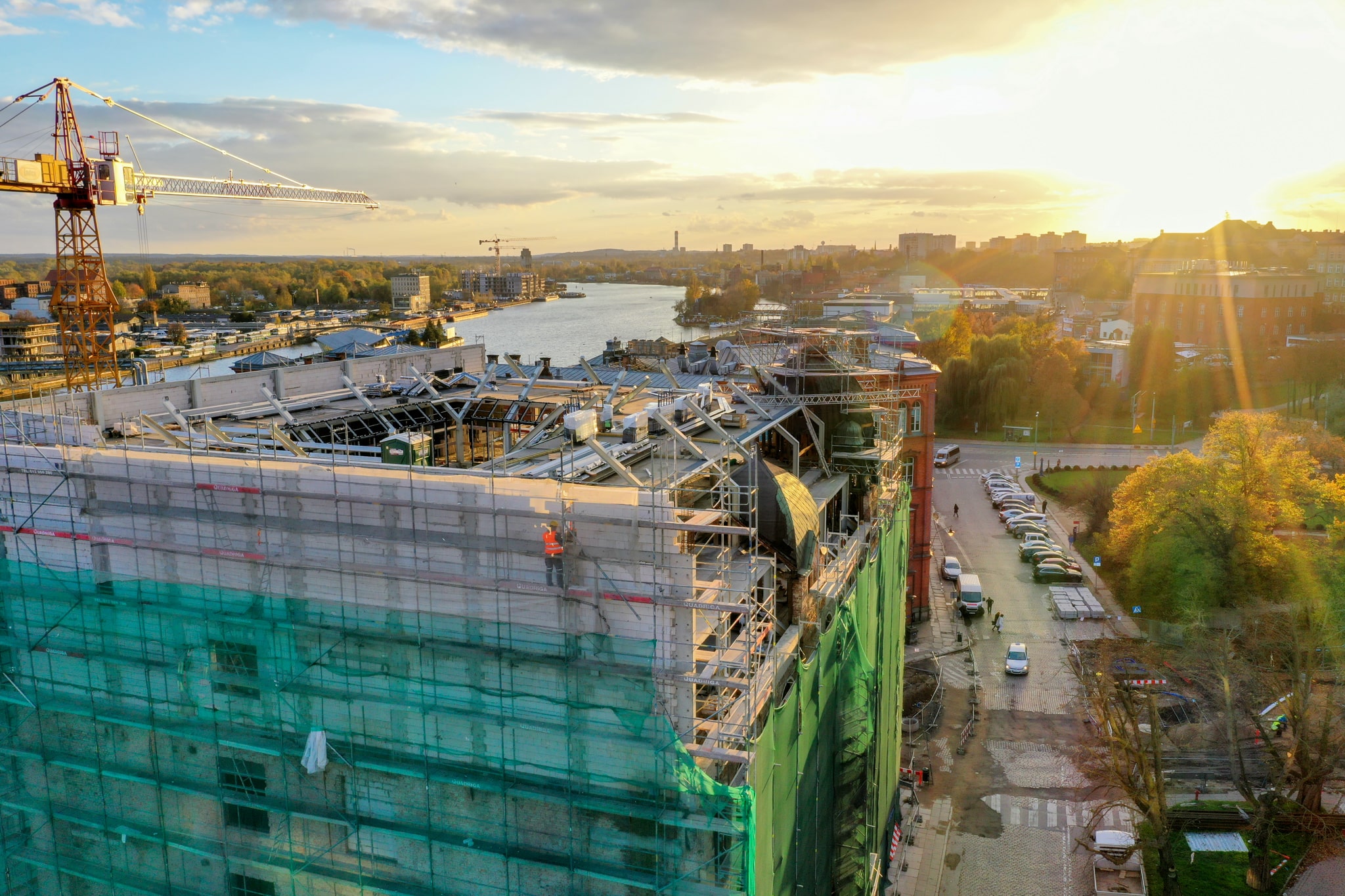 Przepięknie wygląda odrestaurowywany budynek Starej Drukarni w promieniach jesiennego, zachodzącego słońca. W tym kontekście złota jesień nabiera nowego wydźwięku, prawda?